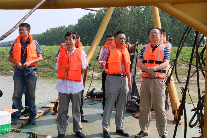 在交通艇上,劉總認(rèn)真聽(tīng)取了安徽交航青弋江疏浚項(xiàng)目的詳細(xì)介紹,了解了施工進(jìn)度和下一步施工計(jì)劃。登船后與船員們一一握手、親切交談,詢(xún)問(wèn)他們生活飲食情況、防暑降溫措施,隨后登上船舶操作室,詳細(xì)了解挖泥船施工技術(shù),通過(guò)GPS定位觀察位于水下的施工作業(yè)面積。劉總囑咐船員們?cè)诖献鳂I(yè)要注意安全,在酷暑天氣保障生產(chǎn)進(jìn)度的同時(shí)切實(shí)做好防暑降溫工作,確保健康防暑、平安防暑。